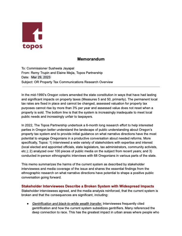 Discussion on the policies, politics, and possibility for property tax reform in Oregon with Multnomah County Commissioner Susheela Jayapal and Topos Partnership.