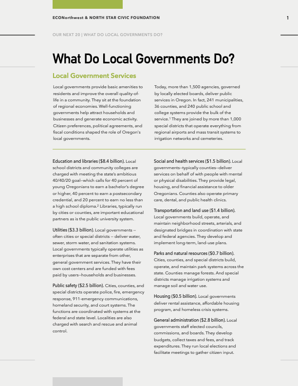In 2017, North Star joined together with Portland State University's Center for Public Service, EcoNorthwest, and a consortium of other foundations, to evaluate the fiscal health and resilience of local governments in Oregon. Our research indicated that cities, counties, schools and other local governments face severe budget shortfalls and service cuts in the coming years. (Original reports here and here.)